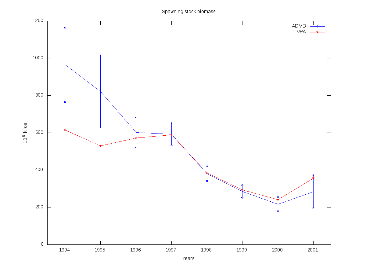 Here the spawning stock biomass is a weghted sum including age groups 3-12 (13 for the VPA estimate), where the weights are the weight at age, and proportion maturity at age.