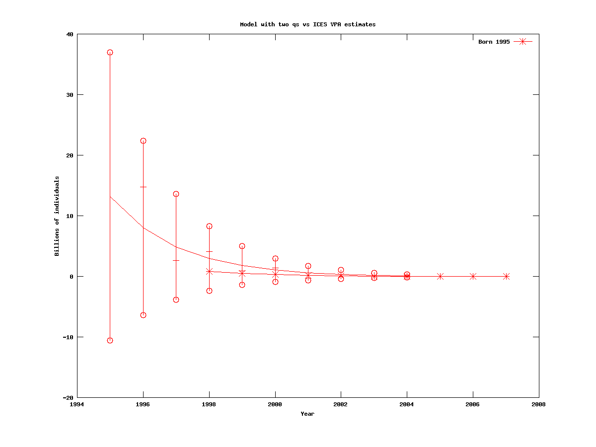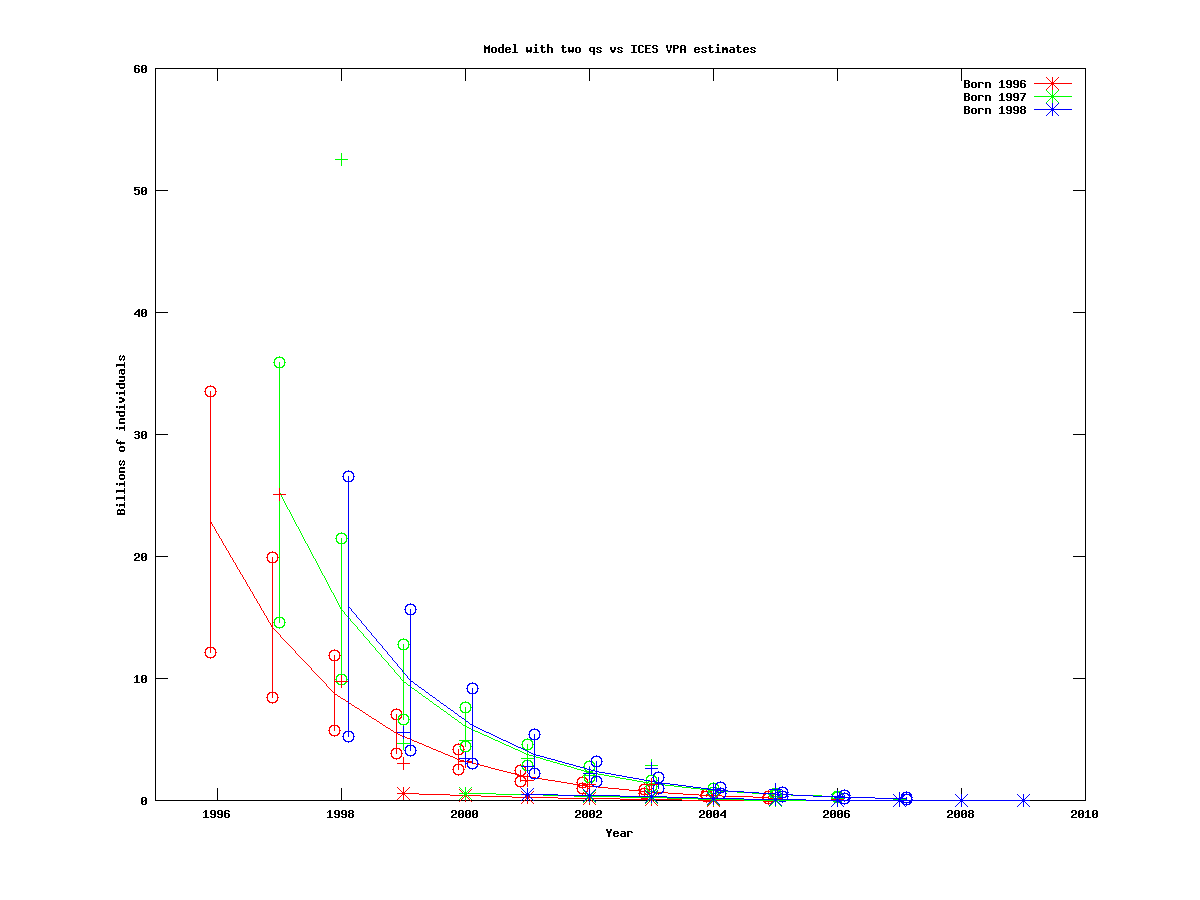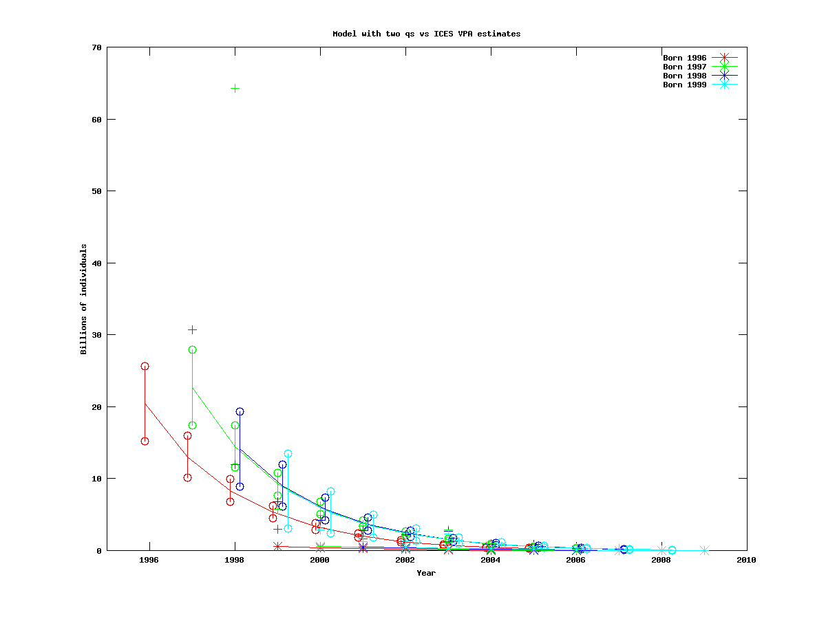 In this section we test the model with two catchabilities, to see how many cohorts should be included when we estimate the cohort sizes.
